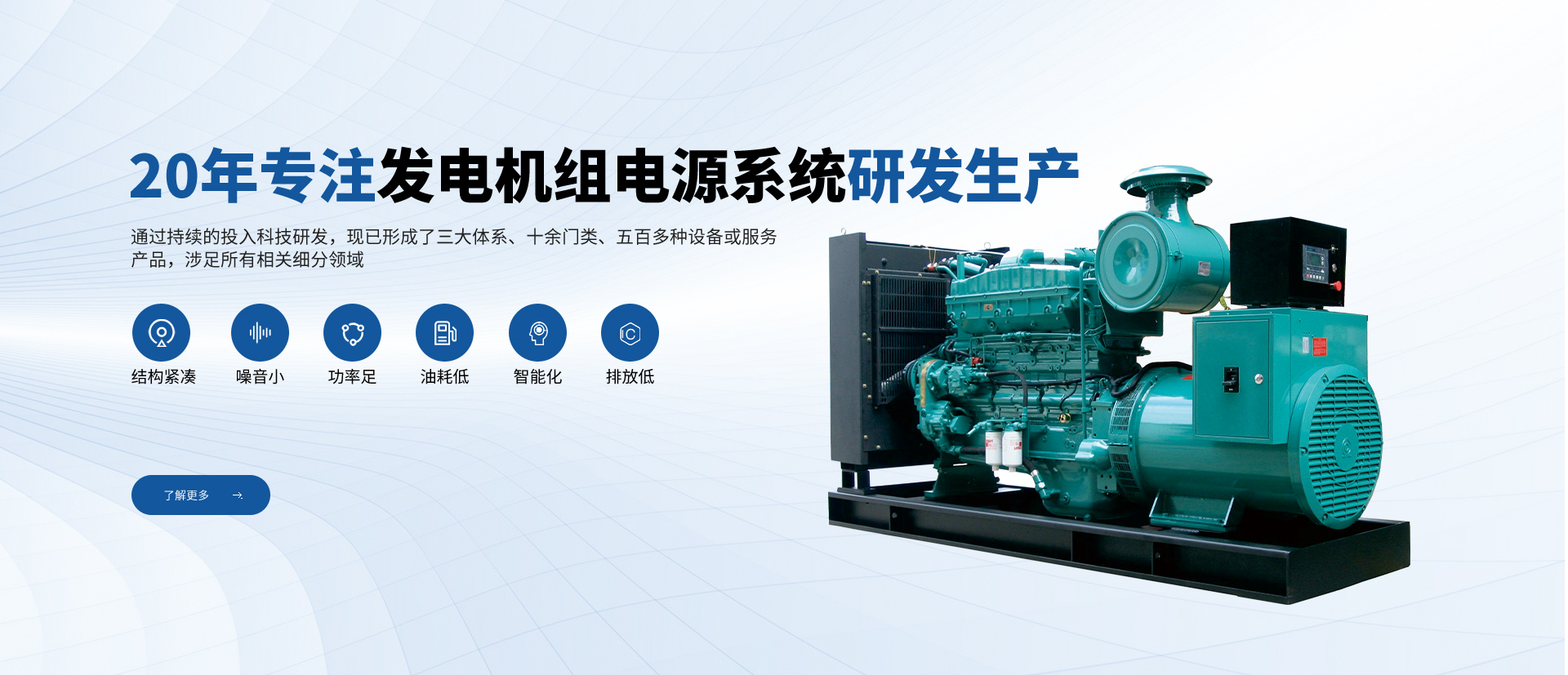 公司一直專注于高品質發電機組及配套設備的研發、生產、銷售和售后服務,致力于為用戶提供完美的產品和服務。從全球知名配套廠商優選零部件及組件,優勢組合,打造名牌發電機組產品。公司在全國設立多處銷售服務網點,體系遍布全國大中城市。